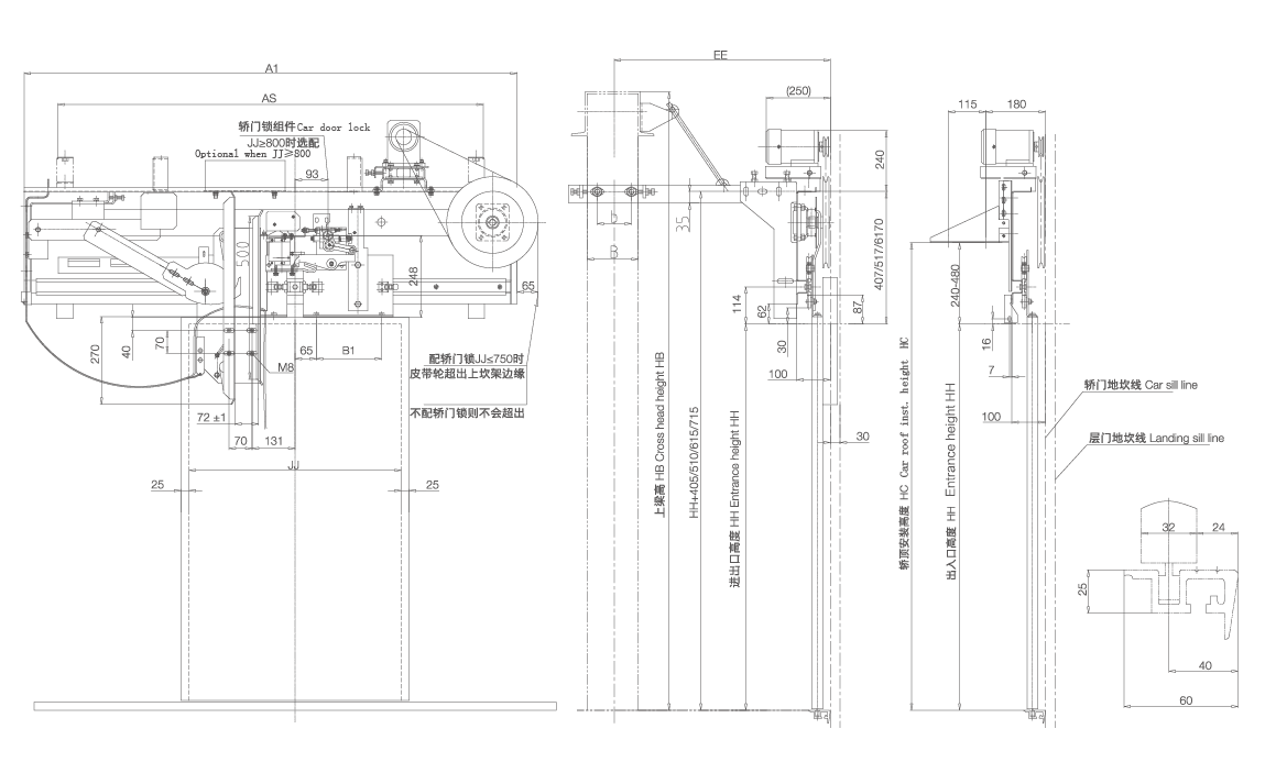 Using asyn. door clutch, car frame, top installation, optional car door lock