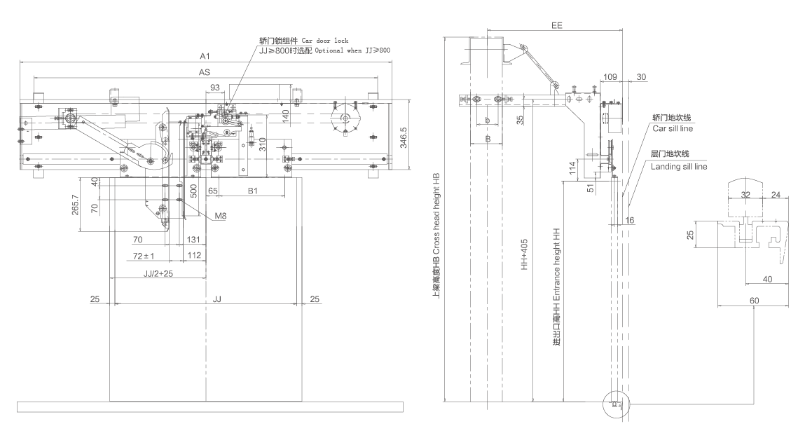4、采用異步門刀,選配轎門鎖;轎架、轎頂、前矯壁安裝方式