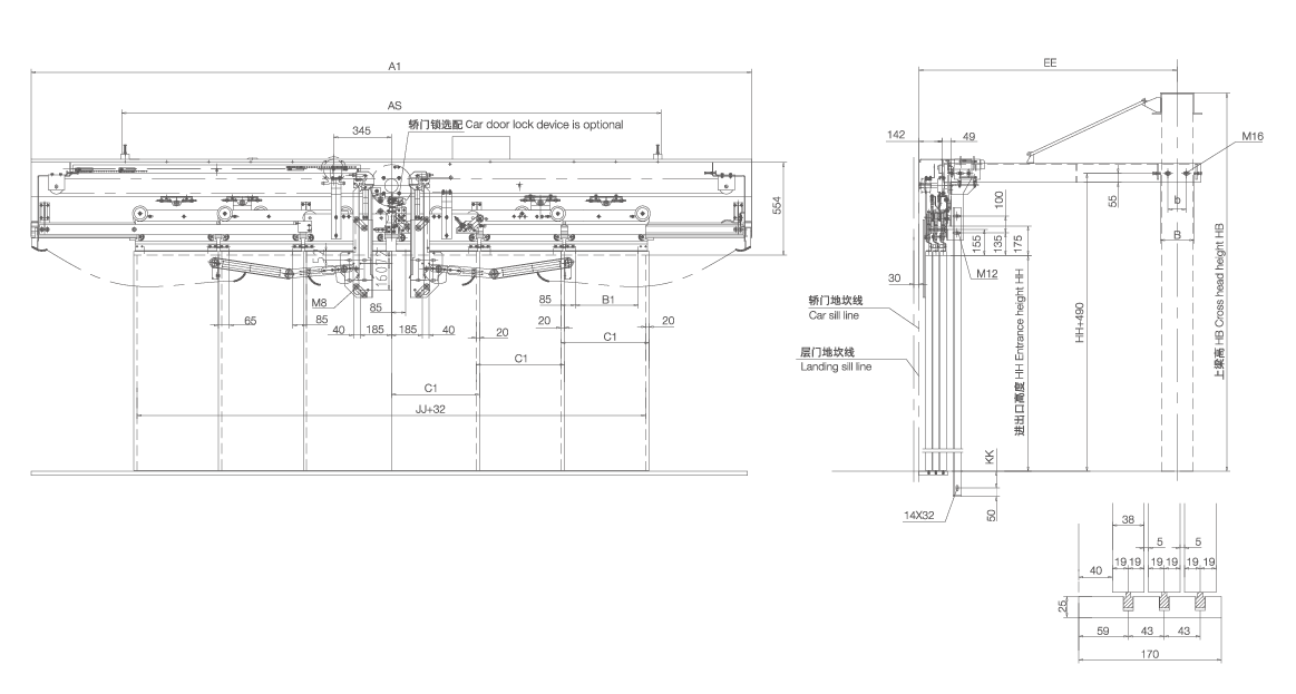 3、采用異步門刀,選配轎門鎖;轎架、轎頂安裝方式