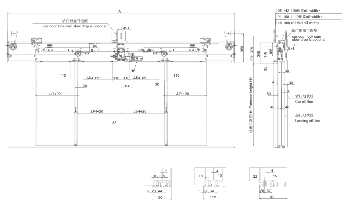 3、采用重錘關(guān)門方式,重錘和導(dǎo)桿置于層門兩側(cè)